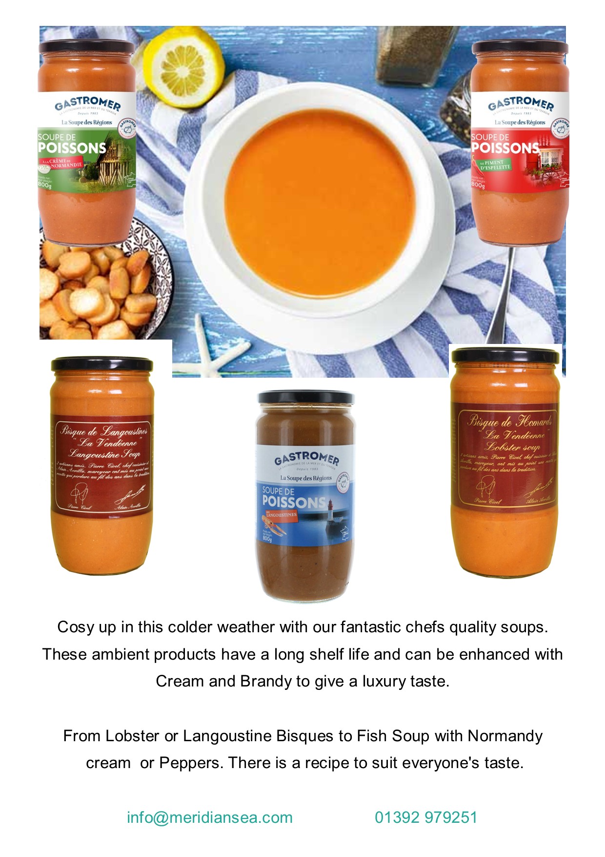 With all this cold and unsettled weather, we have seen a rise in demand for our Fish Soups. These long-life products are packed with flavour and there is an opportunity to add Cream and Brandy to make a gourmet treat. Our most popular soups are the Fish with Langoustine and Lobster Bisque. We also have another six flavours available, all with a long shelf life of 700 days and sold in cases of 6 x 800gm. We are happy to help with any further information please give us a call.